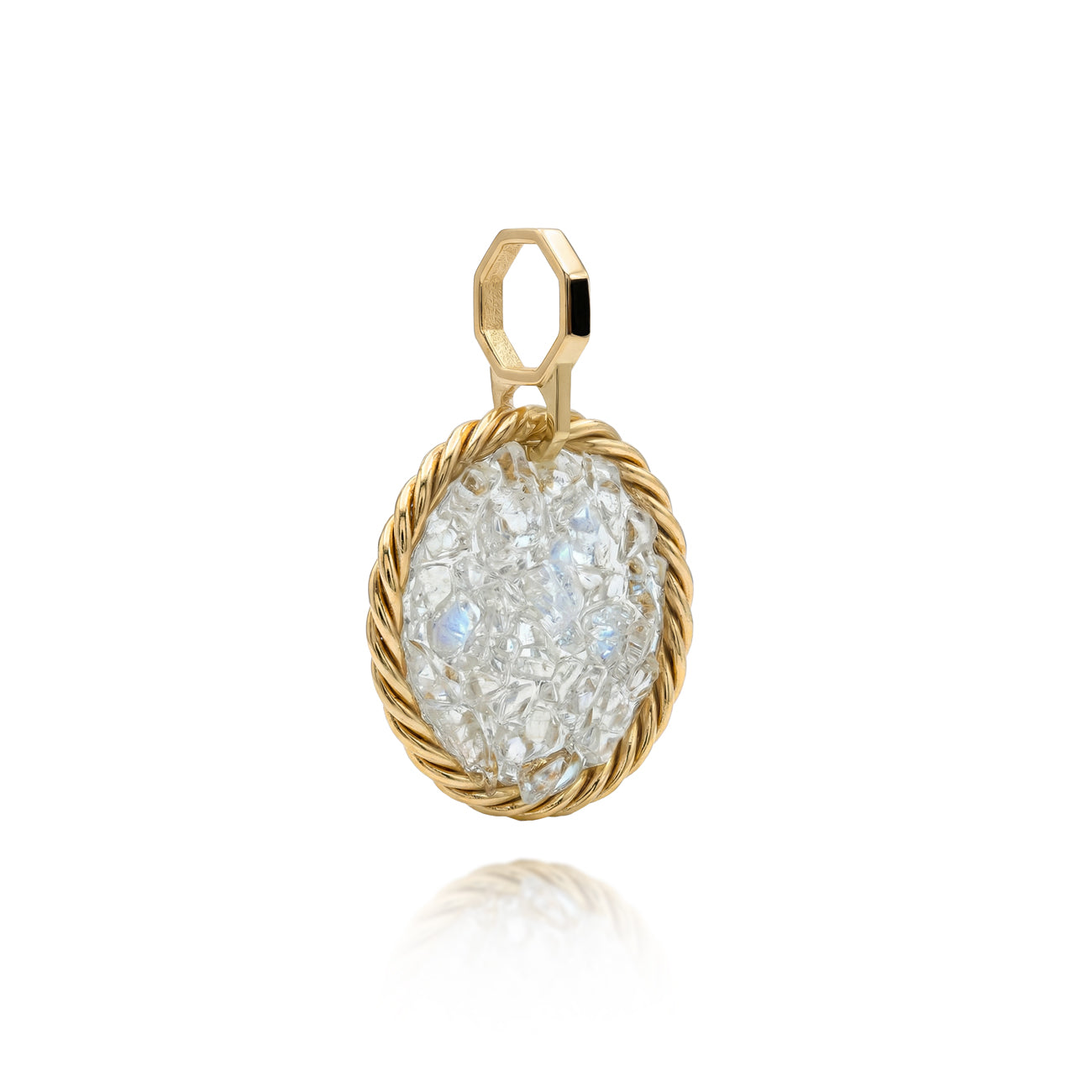Kamień księżycowy z Indii to minerał o subtelnym, mlecznym blasku, który przypomina światło księżyca odbijające się w wodzie. W kolekcji ROYAL TERRA każdy kamień księżycowy jest ręcznie szlifowany w autorskiej geometrii – symbolu duchowego prowadzenia i harmonii cykli natury. To talizman intuicji, wewnętrznego światła i łagodnej siły, który prowadzi przez zmiany z delikatnością i zaufaniem.