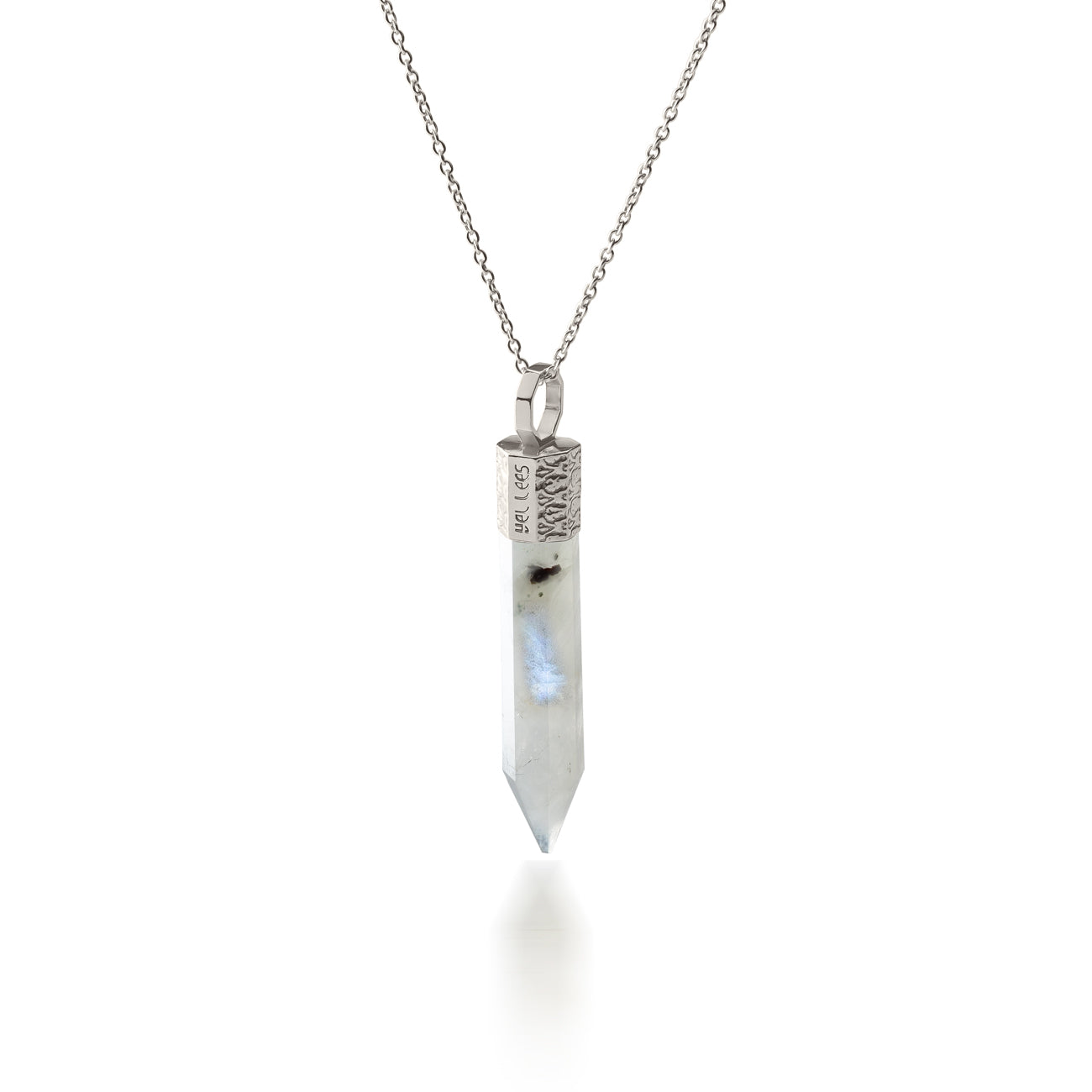 Halskette mit Mondstein 44 mm, 925er Sterlingsilber, platinplattiert aus der Sammlung TERRA 44 Es ist ein Talisman der Intuition, Empathie und spirituellen Erleuchtung. Es spendet Trost, fördert die Intuition und erinnert uns daran, dass jeder Schatten Teil des Lichtzyklus ist. Ideal für sensible, empathische Menschen, die inneren Frieden suchen.